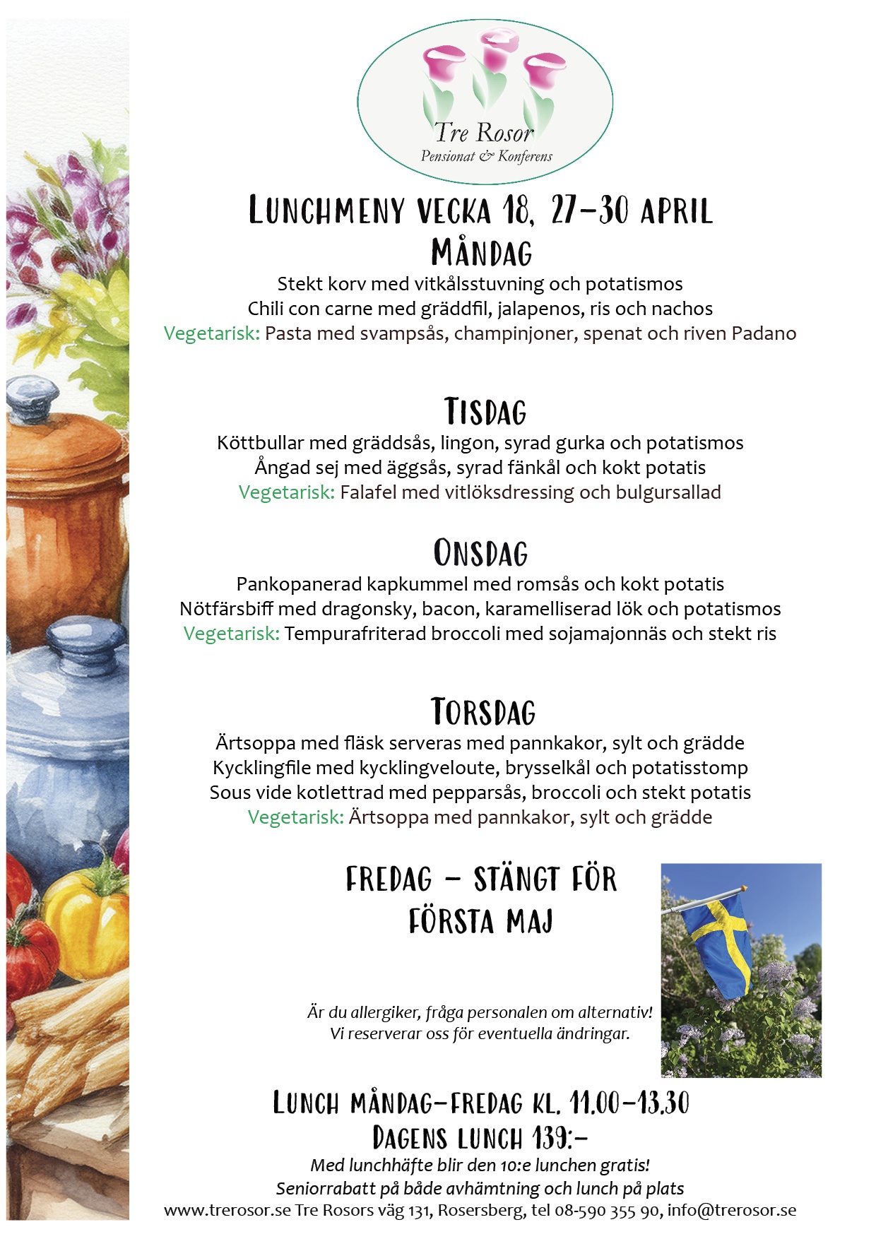 Om ni är ett större sällskap blir vi jätteglada om ni hör av er i förväg, så att vi beräknar rätt mängd mat! Skicka ett mail till info@trerosor.se eller ring oss på 08-590 355 90. Välkommen!